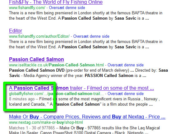 Hits: A reference to the article I just read on Fish&Fly, links to a UK fly forum and... a link to the trailer I just added to GFF! Marked "8 minutes ago". Google surely loves us! Indexed a few minutes after the page has been added. They know where we live!
