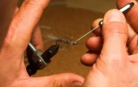 Tail a grizzly hackle tip, grizzly barbs or a thin bunch of gray Arctic fox