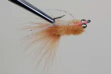 Martin's notice: The fly can be tied with almost any type of orange hair. Arctic fox or squirrel will do fine too. Dumbbell eyes can be tied in on top of the shank to add weight and secure an upside-down position in the water.