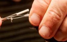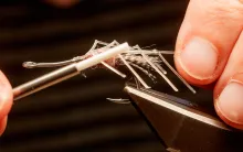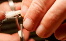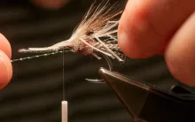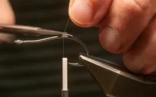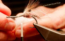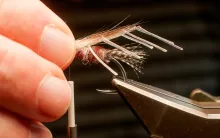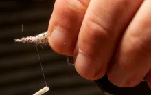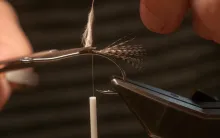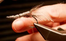These are placed mid-hook, behind the dubbing, and just tied in over the back of the spine. Once positioned, you can take a few wraps between the two rear sets of legs to secure and control the legs, but just leave the rest overhanging the hook bend. They can now dangle and work freely, and look very much like the legs on a real shrimp.