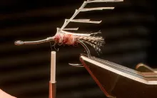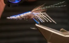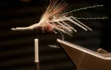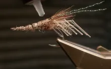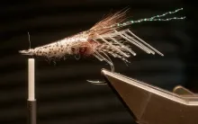 A very prominent feature of most shrimps is what’s often referred to as "the thorn", but is actually called the rostrum by biologists. It’s an elongation of the shell forward between the eyes, and in my case it is made with a small bunch of natural brown bucktail or opossum. Many shrimp patterns exaggerate this feature immensely. I like it to look a bit more like the natural.