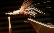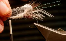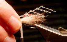 A small ball of dubbing supports the legs and the eyes. Christian uses a lot and in some bright colors. I like my flies skinnier, and here I use some very light colors like white and tan with a bit of olive and/or dull red mixed in.