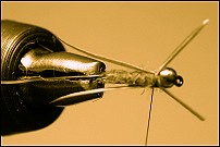 Bring the mylar over the top of the dubbed thorax, tie off at the beadhead, trim and secure with a good whip finish.