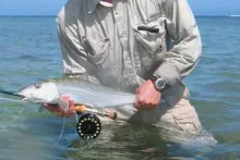 This fly is designed to look like the real thing, but also have enough color and flash to attract attention though slightly murky water. It's light and fluffy, and will land gently. But its lightness also means that it's not a plunger, and it will no sink swiftly in deeper water, so I prefer using it in the shallows, particularly for tailing redfish on the flats.