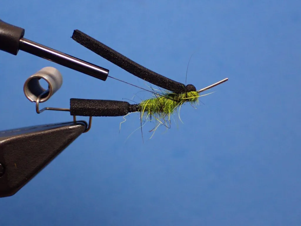 Tie down the foam, creating a segment. Wrap under the body and backwards, over the dubbing (but under the foam), then tie over the foam again and create another segment.