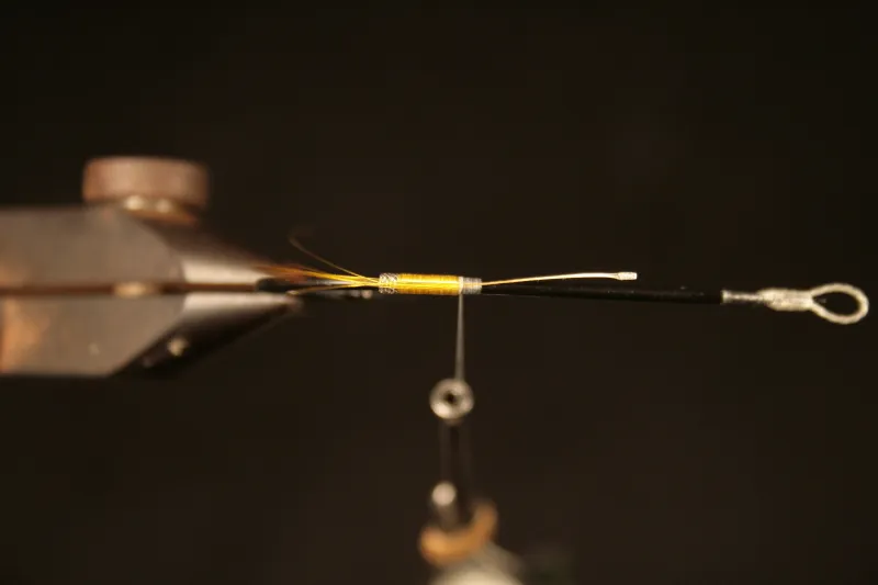 Tie in the tail on top of the hook shank, make sure it is aligned well and strait. If this step is causing problems it is usually because the tie in point is not flattened enough. Cut off the excess end from the tail.