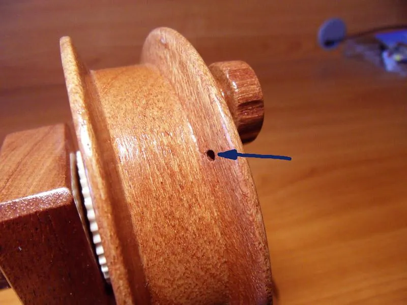 The little hole in the disk, to put the leader or line point through