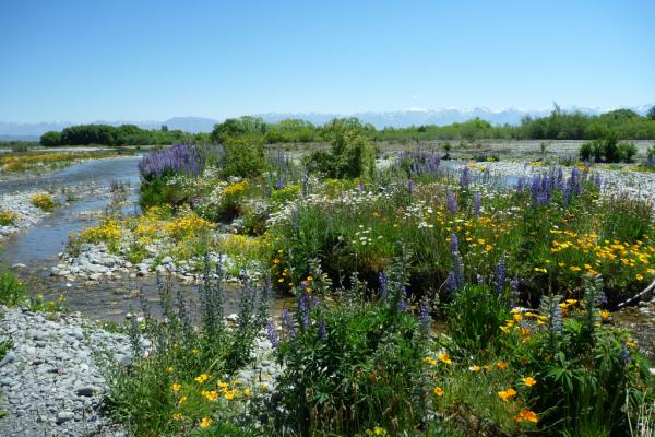 Late Spring on the legendary New Zealand Tekapo River. The islands in this braided system are home to many types of flowers.