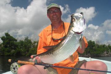 Practice makes perfect, and on the next cast a fish moved for the fly. I struck, and nothing. OK, another cast and another fish attracted and me missing the strike again. I think I managed to try to present my fly at least 14 or 15 times before I finally hooked a tarpon, so unlike Kim who hadn't laid out a cast all morning and when he finally did, broke a rod, I got tonnes of action with many casts, several takes and a good hookup followed by a great fight. A tarpon in the 10 lbs class on a 9 weight is more fun than staring at a guy staring at the water from the stern of a boat.
