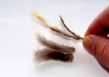 It's a quite fragile feather, and using it requires some delicacy, especially if you use it as a wound hackle. It's typically a dull gray, but is of course also found on dyed skins where it usually takes the dye well.