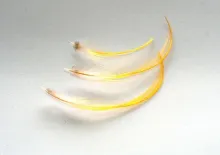 The saddle feathers on the GP are yellow and have fairly long, unwebbed barbs. These feathers are seen in many types of flies, but are predominantly used in classical salmon flies, where tails are often tied with them.