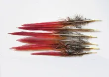 The feathers are used like the yellow saddle feathers, but among them - especially on the side of the bird - you will also find very long fibered feathers that can serve as spey hackle on even larger flies. Even though the really large feathers are few on a skin, there's a pretty nice supply of beautiful and useful red spey hackles on a single skin.