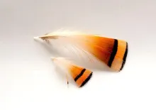The crest feathers are most known for the use in salmon flies where they serve as tail and toppings. Their bright, delicate yellow color and fine structure is quite unique, and a large number of classical salmon flies would not be the same without this characteristic feather.